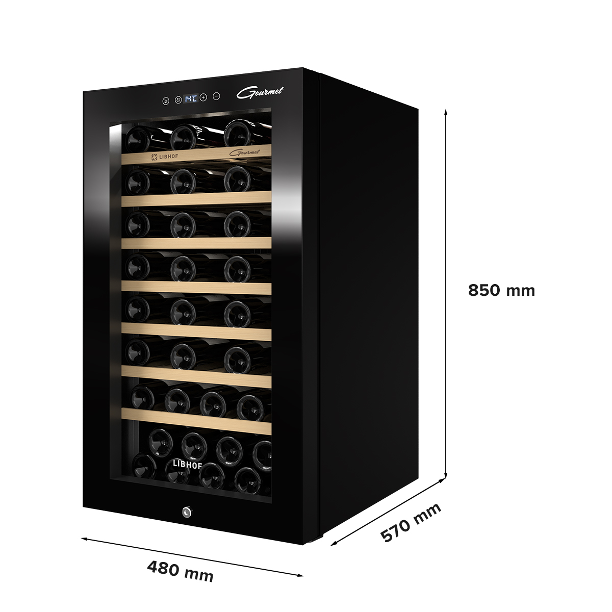 Монотемпературный винный шкаф Libhof GM-56 имеет одну зону охлаждения и позволяет регулировать температуру в диапазоне от 5 до 20 градусов, что делает его подходящим для хранения различных видов вин. Винный холодильник оснащен 7 деревянными полками на которых помещается 56 бутылок типа бордо. Отдельностоящий винный шкаф оборудован современной компрессорной системой, которая значительно снижает уровень вибрации и шума. Управление винным холодильником производится с помощью сенсорной панели, а на цифровом дисплее отображается температура внутри камеры. Дверца шкафа имеет дымчатый стеклопакет с UV-фильтром, надежно защищающим вино от ультрафиолетового излучения. Белая светодиодная подсветка подчёркивает очертания винных бутылок. Модель имеет прямое охлаждение – естественная циркуляция воздуха поддерживает оптимальный уровень влажности и микроклимат приближенный к винному погребу, создавая эффект «плачущей стенки». Для защиты Вашей винной коллекции предусмотрен замок. Данная модель холодильника для вина обладает функцией памяти настроек, которая позволяет сохранять заданные параметры температуры и освещения даже после отключения питания.